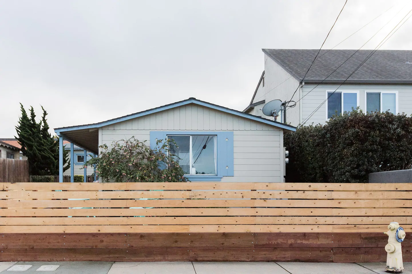 La casa blanca con ribetes azules se construyó en los años 30 y conserva algunos toques vintage: un tejado inclinado, un salpicadero de lunares en las paredes del baño y una paleta de colores azul bebé en toda la casa. Un frigorífico Smeg liso en la cocina contribuye aún más a la estética retro.