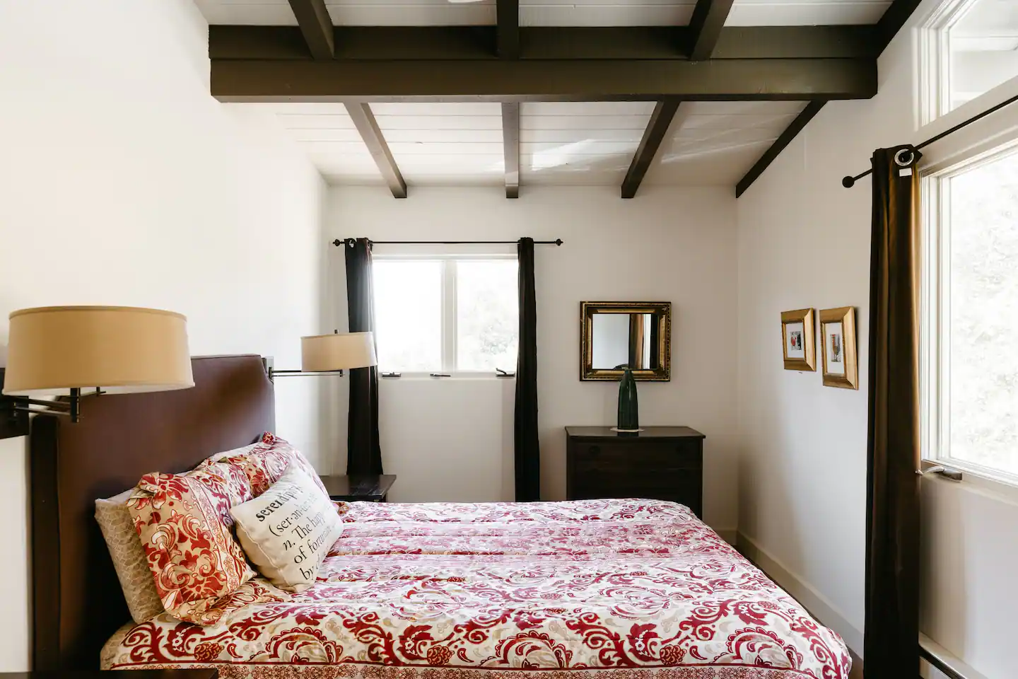 Con una cocina moderna remodelada que tiene un horno de gas y utensilios de cocina de color verde azulado, esta cabaña es un compromiso entre rústico y conveniente. El techo abierto con vigas de madera, vidrieras originales, rincón de lectura, y la hamaca son toques acogedores.