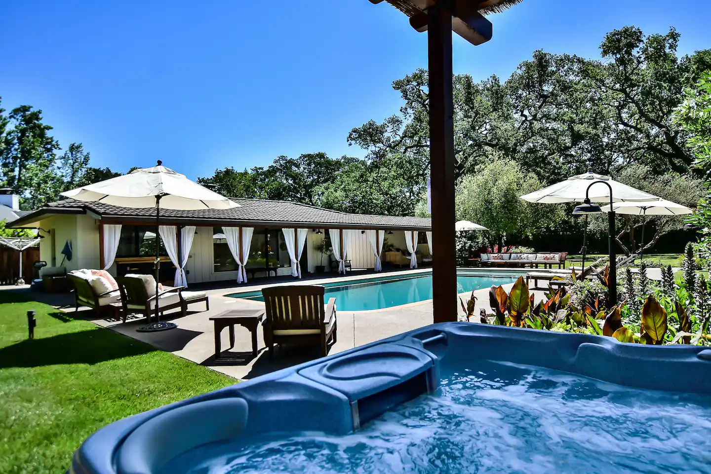 Si deseas alojarte en Sonoma, esta colorida casa de cinco dormitorios está a 10 minutos del centro, pero parece estar en otro mundo.