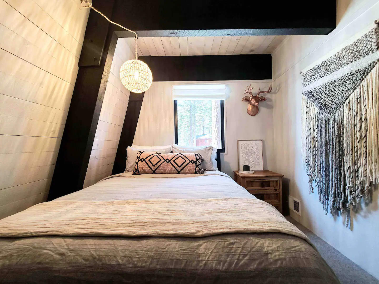 Esta renovada cabaña con estructura en forma de A de 1973 está llena de carácter, desde la chimenea de piedra hasta la habitación abuhardillada con literas para los niños (Hay cuatro dormitorios reales para que el resto de la familia se reparta).