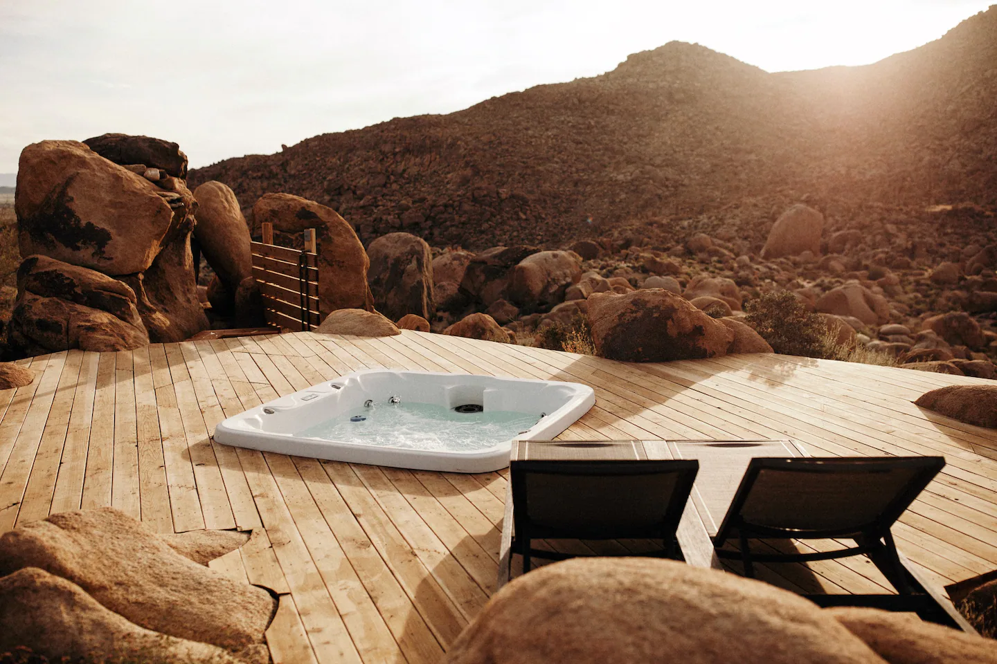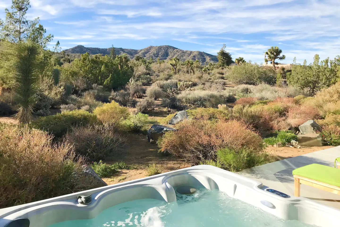 La idea de darse un chapuzón diurno en este jacuzzi con vistas a la línea montañosa del Parque Nacional Joshua Tree sólo es superada por la idea de darse un chapuzón nocturno bajo las estrellas ultravisibles.