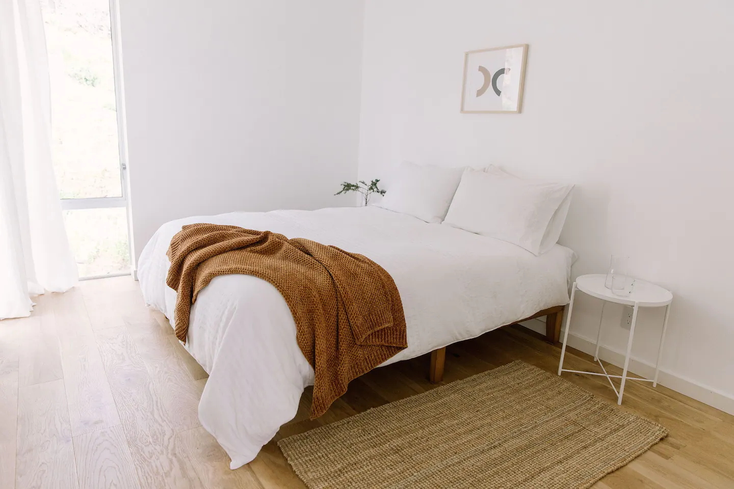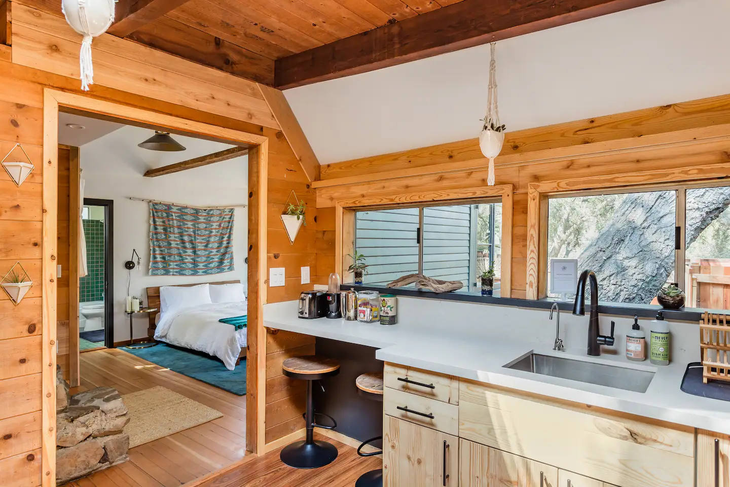 El espacio de tamaño estudio se centra alrededor de una cama de matrimonio, tiene ventanas en los cuatro lados, y es central para cenar fuera, senderismo, surf y días de playa.