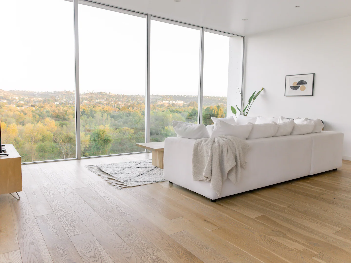 Los mejores servicios: Ventanas de la sala de estar del suelo al techo con vistas a un embalse.