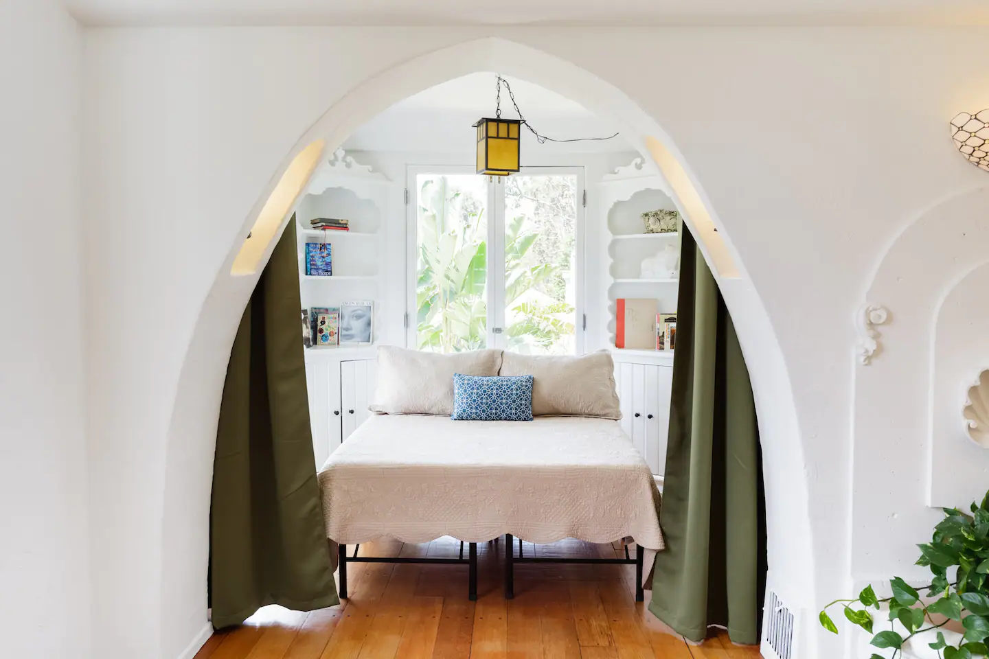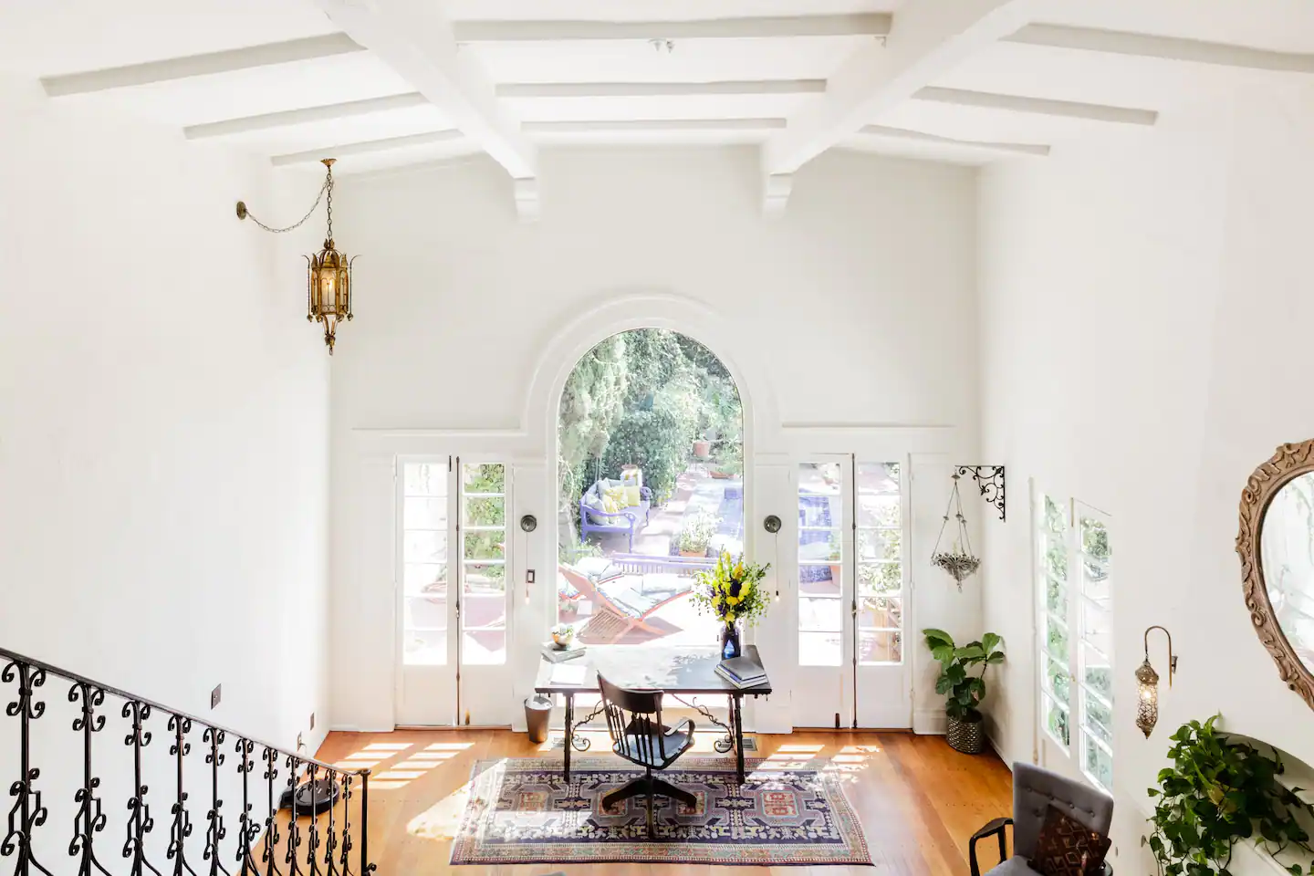 Los sueños de las décadas más glamurosas cobran vida en esta villa bajo el cartel de Hollywood. Los interiores y exteriores sólo pueden describirse como preciosos: arcos de piedra tallada enmarcan un dormitorio y el comedor, y finos remolinos de hierro componen la barandilla de la escalera.