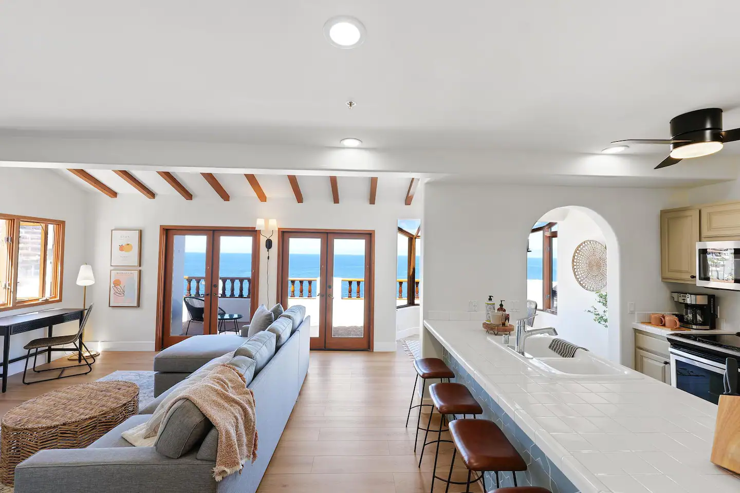 Prepara un Aperol Spritz en el bar de baldosas de cemento y observa ballenas y delfines desde la terraza exterior. O disfruta de una vista más cercana del agua bajando hasta la orilla de Avalon en el carrito de golf de la unidad.