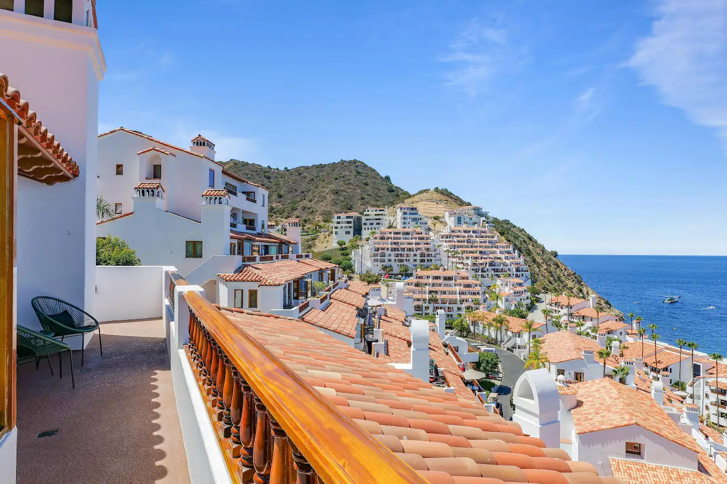 Las pasarelas arqueadas y los azulejos españoles son bastante evocadores, pero son las gloriosas vistas de la costa azul de Catalina las que podrían ser la costa de Amalfi.